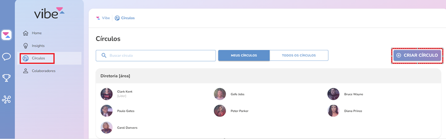 O círculo é um agrupamento onde ficam os colaboradores na plataforma, ou seja, é onde é feita a estruturação das equipes. Os líderes terão autonomia para criar e dar manutenção nos seus círculos. Os círculos cadastrados ficarão visíveis para todos os usuários do Vibe Metadados, porém, a edição é apenas para o líder do círculo ou administrador do sistema.
