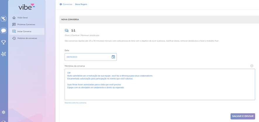 Obs.: Os campos a serem preenchidos são data (data que ocorreu a conversa) e memórias da conversa (o que foi conversado com o Colaborador). Estes campos são obrigatórios.