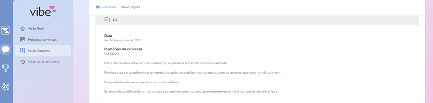 6. O registro da conversa será enviado para o e-mail do Colaborador e ficará visível no VIBE acessando o Menu Conversas > Histórico de Conversas, no login do Líder e Liderado.
