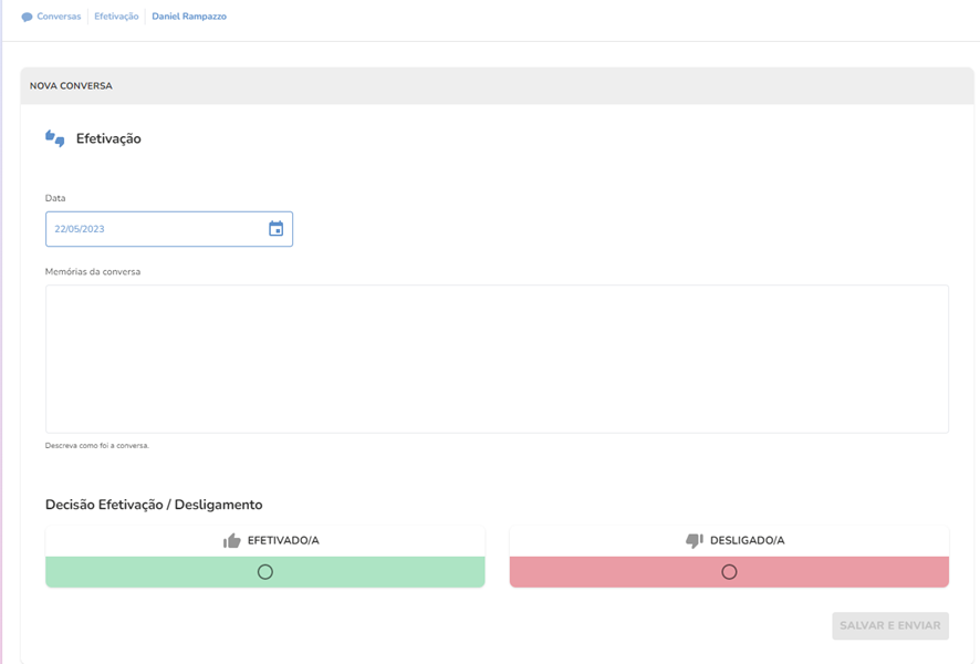 Ao clicar na agenda de conversas, é possível preencher as informações da conversas definindo a data que ela esta sendo realizada, a memória da conversa e se o liderado será efetivado ou desligado. A conversa pode ser preenchida durante a realização da Conversa de Efetivação com o liderado ou após.